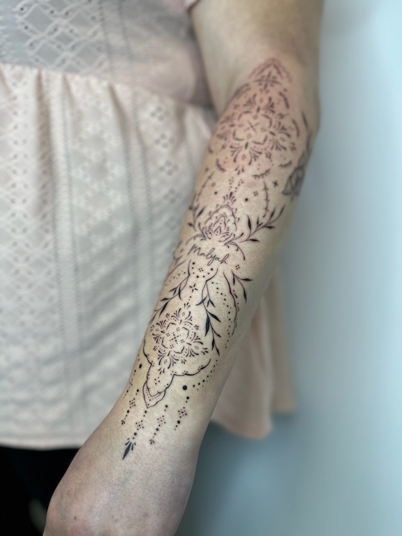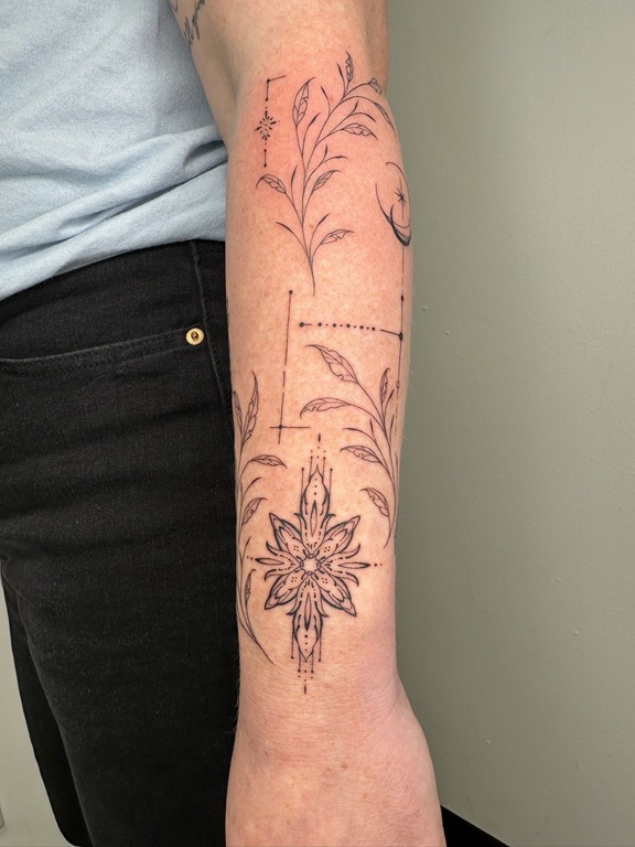 Ich bin Celine und bin seit einem Jahr im Tattoostudio Stichfest in Würzburg am Start. Meine Stilrichtungen sind „Fineline“, „Ornamental“ und „Linework“, was bedeutet, dass ich mich auf feine, detailreiche Designs spezialisiert habe.